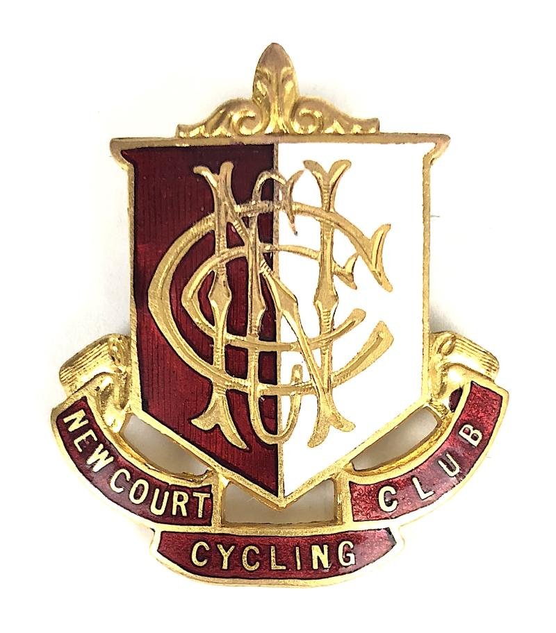 A scarce original early 20th century period 'Newcourt Cycling Club badge'; an impressive gilt metal example bearing the cycling clubs cypher on red and white enamel shield resting in a trio part title scroll. Very good condition, complete with original pin fittings, no damage to the enamel, an excellent example.Height approx 38mm.