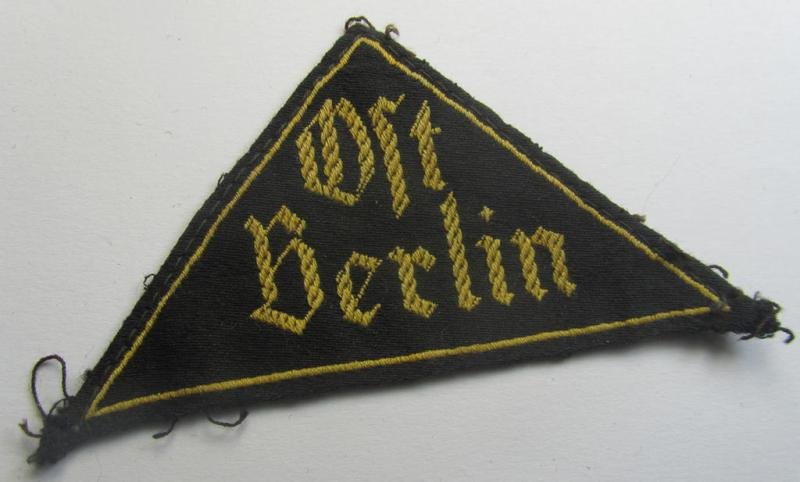 Scarcely found, 'HJ' ('Hitlerjugend') district-triangle (ie. 'Gebietsdreieck') entitled: 'Ost Berlin' (being a clearly used example that is void of an 'RzM'-etiket)