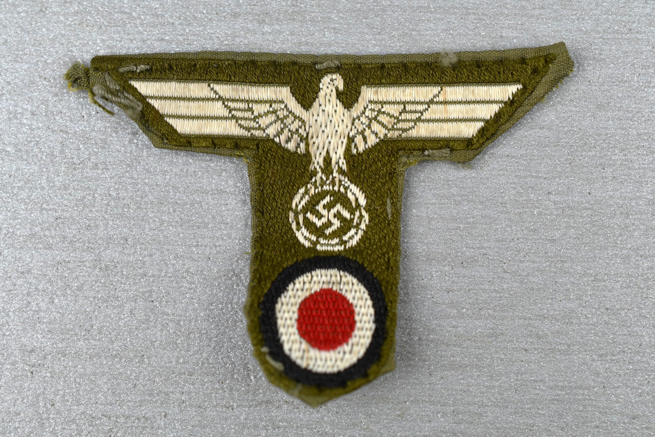 Genuine worn and cap removed eagle for an einheitsfeldmütze for a member of the Org. Todt. T-shape eagle, shows light wear. Flat woven Bevo consturction.