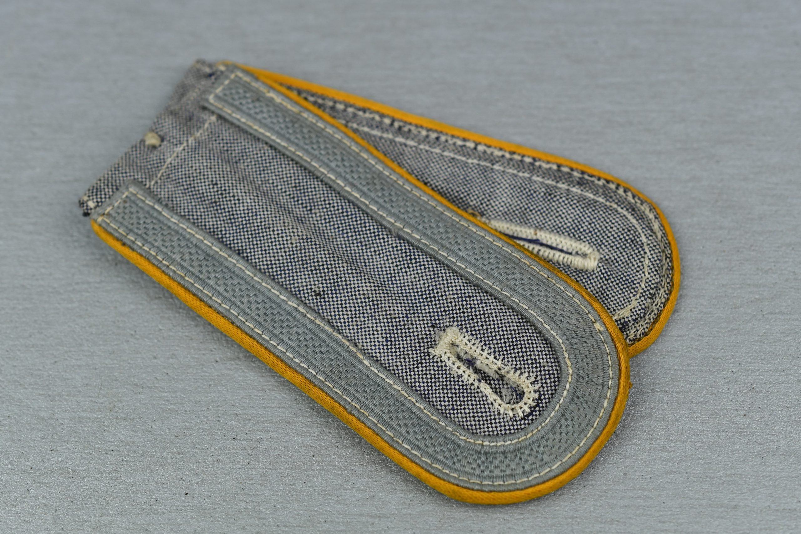 Rare pair of Luftwaffe shoulder boards being gold yellow piped pieces for a pilot (Flieger) or paratrooper (Fallschirmjäger). These boards are made to be worn on the blue summer shirt, in the same material. Boards have the rank of Unteroffizier, factory applied. These boards are MINT and never issued, still sewn together. A must have for any shoulder board or Luftwaffe collector!