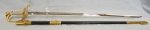 Original period manufacture. A near new condition regulation US Navy Officers sword, made in Germany and imported by Hillborn-Hamburger of New Jersey.Flawless 32 inch chromed steel blade running straight and true, etched panels on each side of the blade with area reserved for the owners name to be engraved. Gilded brass guard and pommel, with an imitation fish-skin grip which is bound with double strand twisted wire.Leather covered, metal bodied scabbard with beautifully gilded metal fittings. The sword is a lovely example, showing minimal handling and wear.