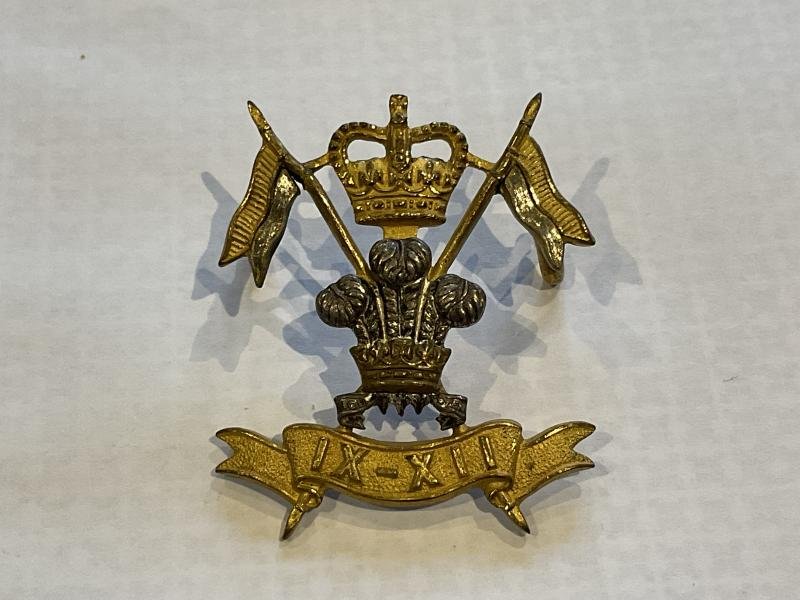 High quality bi-metal Officers 9th/12th Hussars cap badge by Gaunt.Long loop rear fixing.