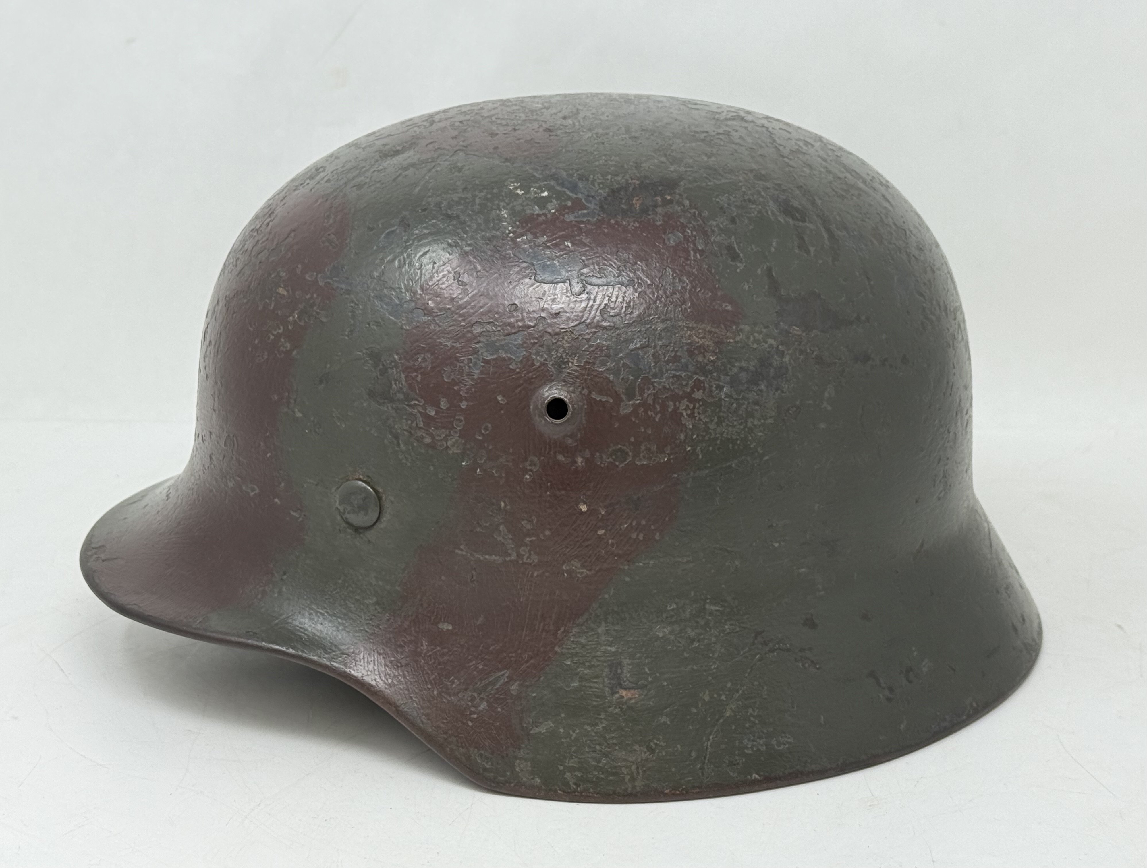 M35 Camo Helmet by Quist size 64, with unknown batch number. Helmet features green and dark brown camo brushed finish. Helmet is equipped with original liner and chinstrap. Helmet is in excellent condition and would make a fine addition to the camo collection. COA accompanies.