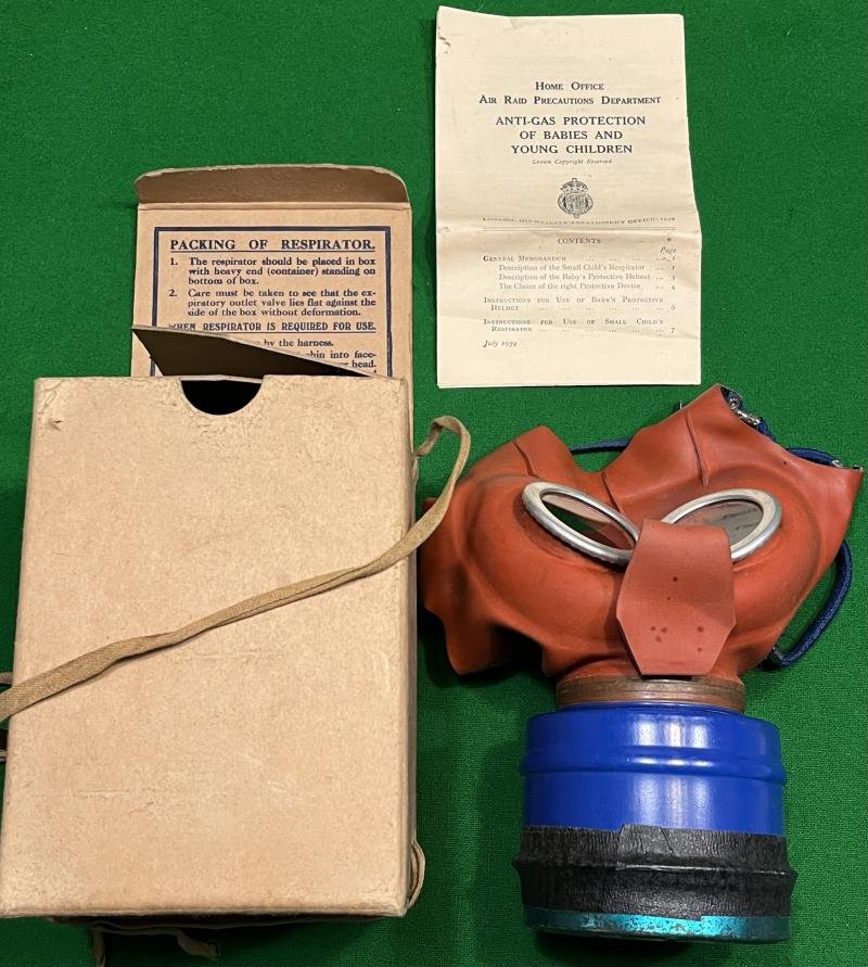 example of the small child's respirator contained in it's original cardboard case and complete with explanatory leaflet. Produced in a child friendly orange rubber with a blue coloured filter similar to the American produced child's mask that was specifically designed to look like Mickey Mouse and to be less frightening to children. The British version was less convincing and this example was produced by the Leyland and Birmingham Rubber Company Ltd., in 1940 and is fitted with the Cortex Extension filter. In good, supple condition with all elastics intact. Cardboard case in used condition with some marking, rubbing complete with carrying strap. Excellent example.