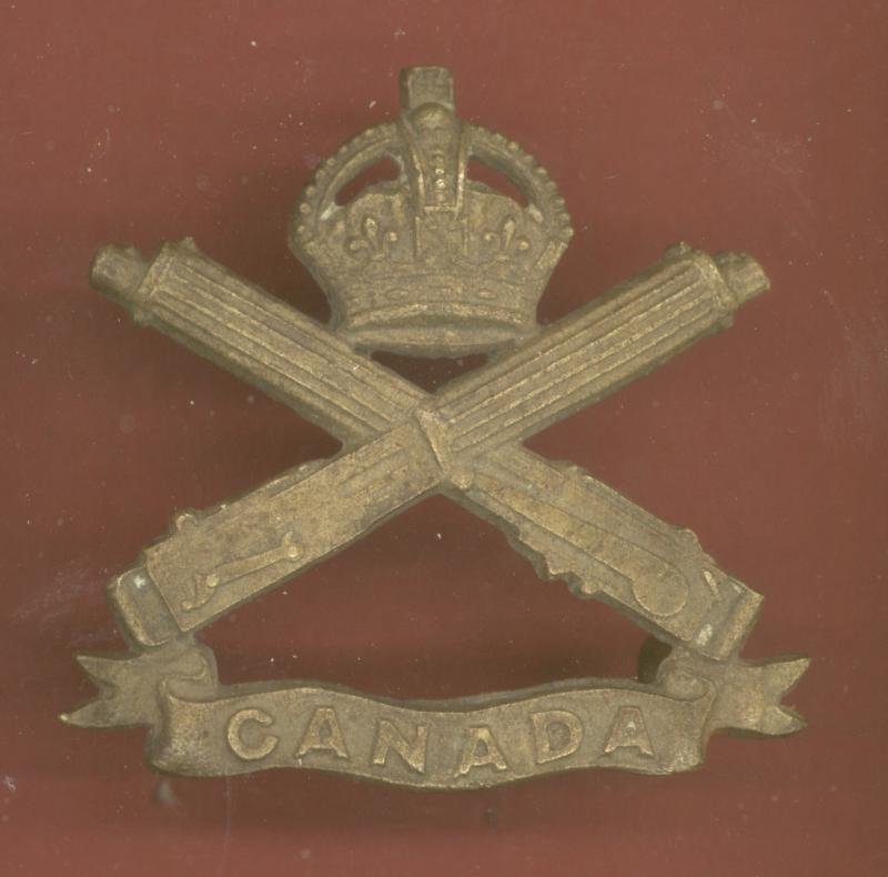 A good scarce solid die cast brass / bronze example. Crowned crossed Vickers machine guns on CANADA scroll. Two loops to the reverse. VGC