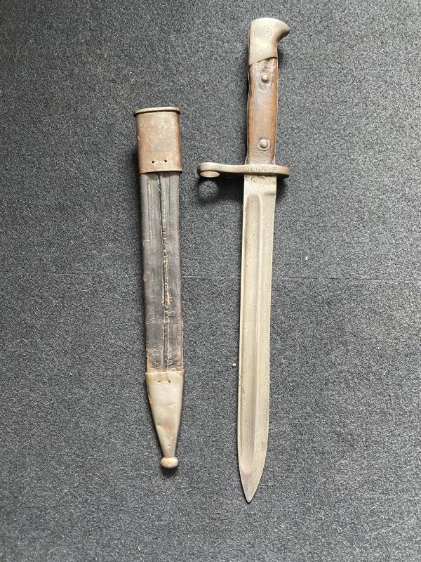This is a Spanish Mauser Bayonegt with its scabbard, on the cross guard it has the number 3359B. This is an age restricted item. Proof of age must be provided. U.K. Sales Only.Check out our YouTube channel below.https://m.youtube.com/results?sp=mAEA&search_query=chase+militaria+