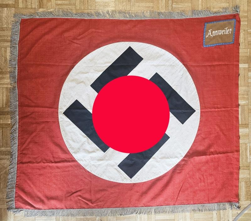 'Ortsgruppenfahne' de la ville de ANNWEILER dans le Palatinat.C'est le drapeau de la section locale du NSDAP de cette localité.Pièce en bel état avec quelques trous de mites discretsdécoupé de ses annauxBel état !