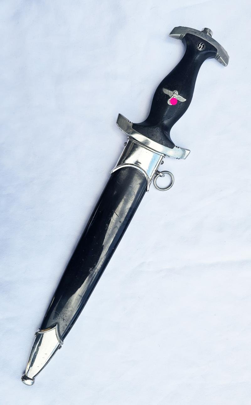 Très belle dague SS M33 '188/36', de fabriquant inconnu, portant un marquage assez rare nous indiquant l'année de fabrication de 1936.Avec une très belle lame gardant une bonne partie de son grain d'origine et une devise très nette !Ces dagues s'apparentent à des dagues précoces lourdes, avec des croisières en maillechort, à l'exception du fait que le fourreau est peint et non anodisé.L'aigle est également en maillechort et le bouton de runnes conserve l'ensemble de son émailLes visses sont intactes.La jonction entre la garde et le foureau est parfaitement ajustée.Très belle pièce d'une dague SS33