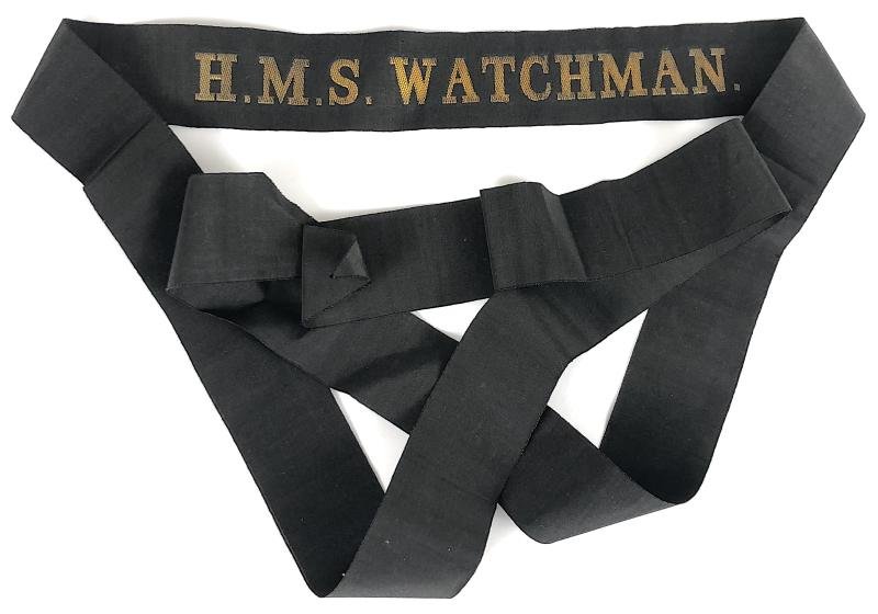 A rare ORIGINAL circa First World War period 'H.M.S. Watchman cap tally ribbon', gold bullion embroidered lettering with small dots on extra long silk ribbon. Very good condition.Length approx 120mm.HMS Watchman was a W-class destroyer launched in 1917 that saw service in World War I, in the Russian Civil War, and in World War II.