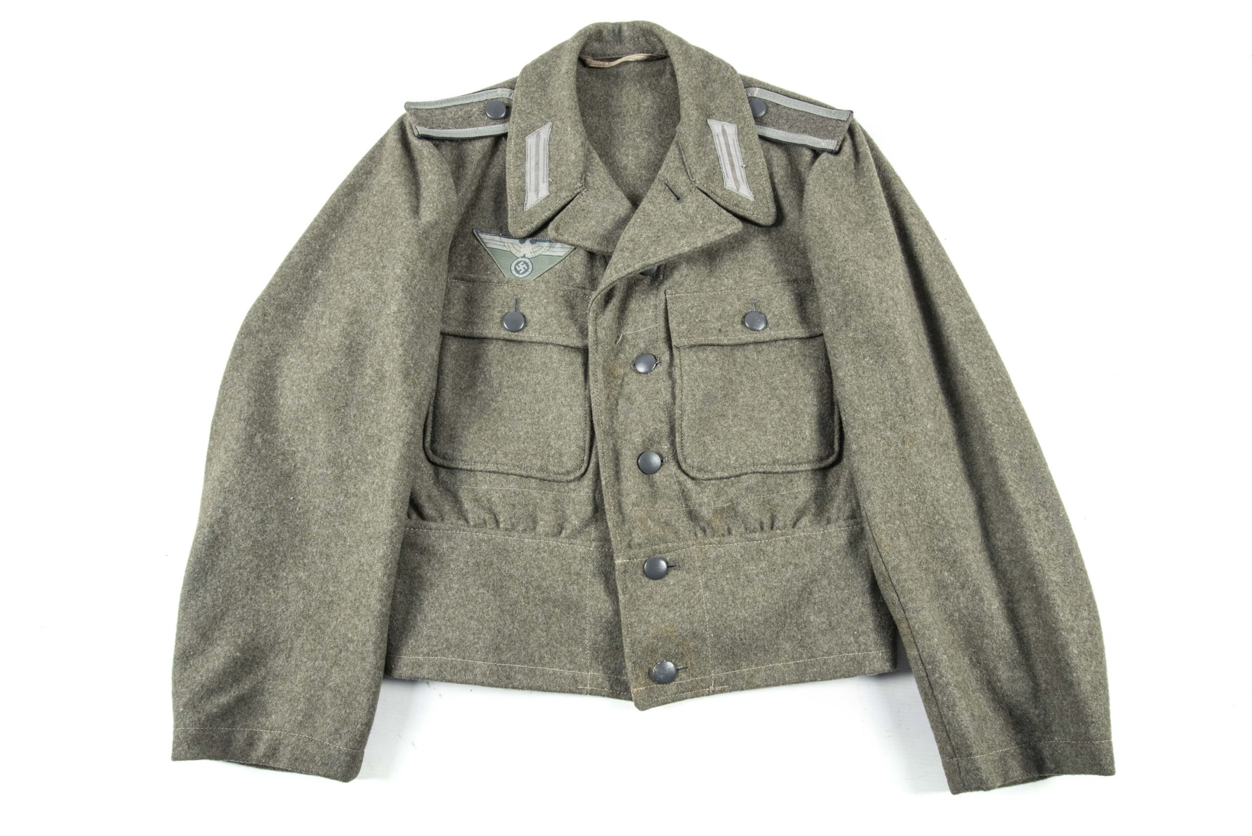 Textbook late war Heer M44 EM field blouse in mint, unissued condition. The garment retains its full period factory sewn insignia. The shoulderstraps are a textbook late war simplified pair for a Unteroffizier der Pioniere. The breast eagle is a rare printed M44 type period sewn through the lining prior to final assembly of the garment. TheEinheitskragenlitzenare machine sewn through the collar. Perfect M44 field blouse with rare printed eagle which would be impossible to upgrade!