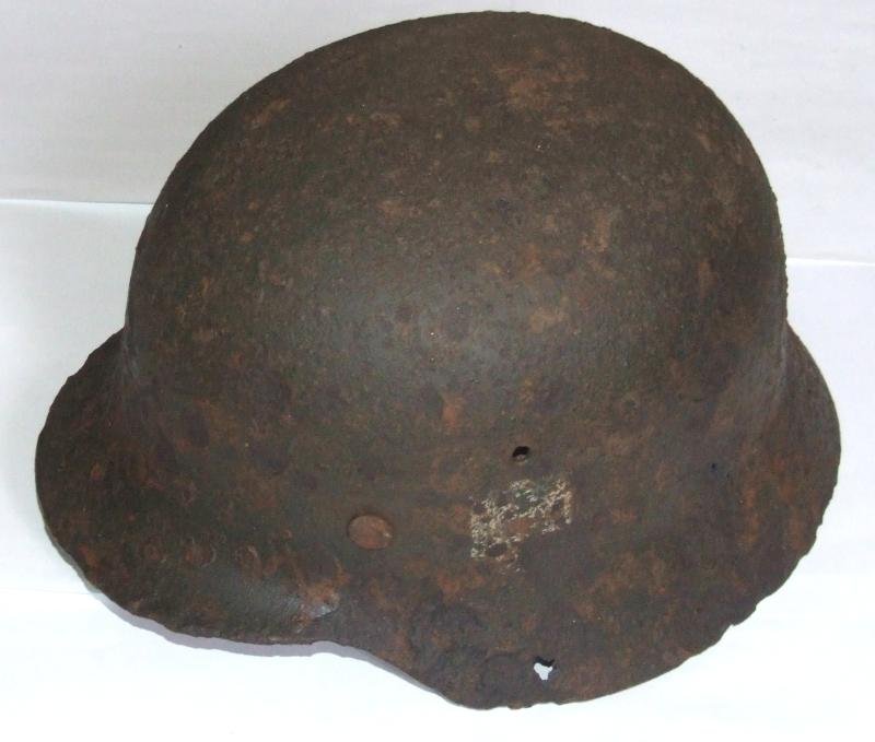 An army M35 single decal helmet in semi-relic condition. Remains of field green paint with a 35 per cent decal. Considerable pitting on outer shell and around rim. One rust hole in lower skirt. Lot number 353 stamped on inner skirt. No discernible size or maker stamps. Hide liner is in better condition than the helmet shell so may be a later replacement. Chinstrap bales present but no chinstrap.