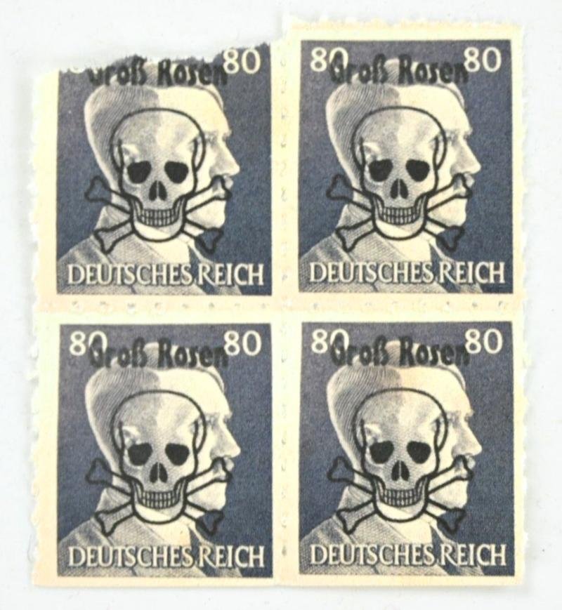 In a nice condition a set of 4 German Wartime Post Stamps of Adolf Hitler.The stamps are just after the war overprinted with the skull and bones, a marking of poison and the text 'Gross-Rosen', indicating the deathcamps Hitler issued.A very nice anti-Hitler stamp set!