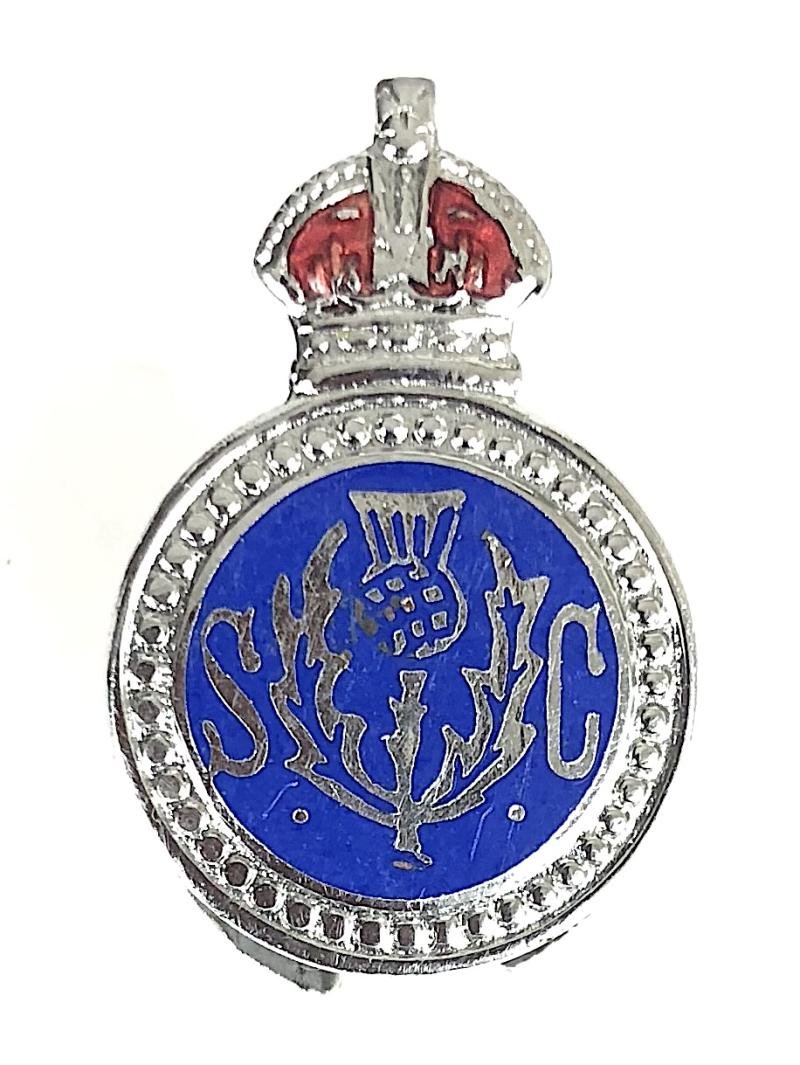 A very scarce original circa Second World War period Scottish 'Peebleshire Special Constabulary Police home front badge'; chromium plated red enamel Crowned dotted title surround, the centre bearing thistle between 'S C' on ble enamel ground; the reverse impressed with maker's details 'Thomas Fattorini Ltd Regent St Birminham' and low issue number '284'. Very good condition, complete with original buttonhole fitting, no stress marks or enamel loss.Height approx 29mm.