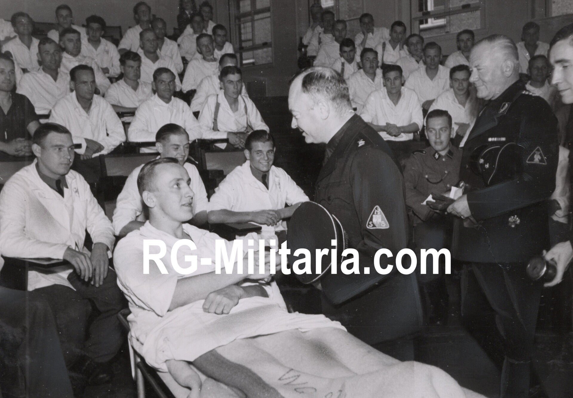 Original WW2 Dutch Collaboration NSB Press Photo - Anton Mussert and Tonny Kessler visit a wounded soldierApproximately 18 x 13 cmBy A. Stapf Bilderdienst.Tonny Kessler is wearing a Lijfwacht Mussert sleeve insignia.Origineel Wo2 Nederlandse Collaboratie NSB Persfoto - Anton Mussert en Tonny Kessler bezoeken een gewonde militairOngeveer 18 x 13 cmDoro A. Stapf Bilderdienst.Tonny Kessler draagt een mouwinsigne van Lijfwacht Mussert.