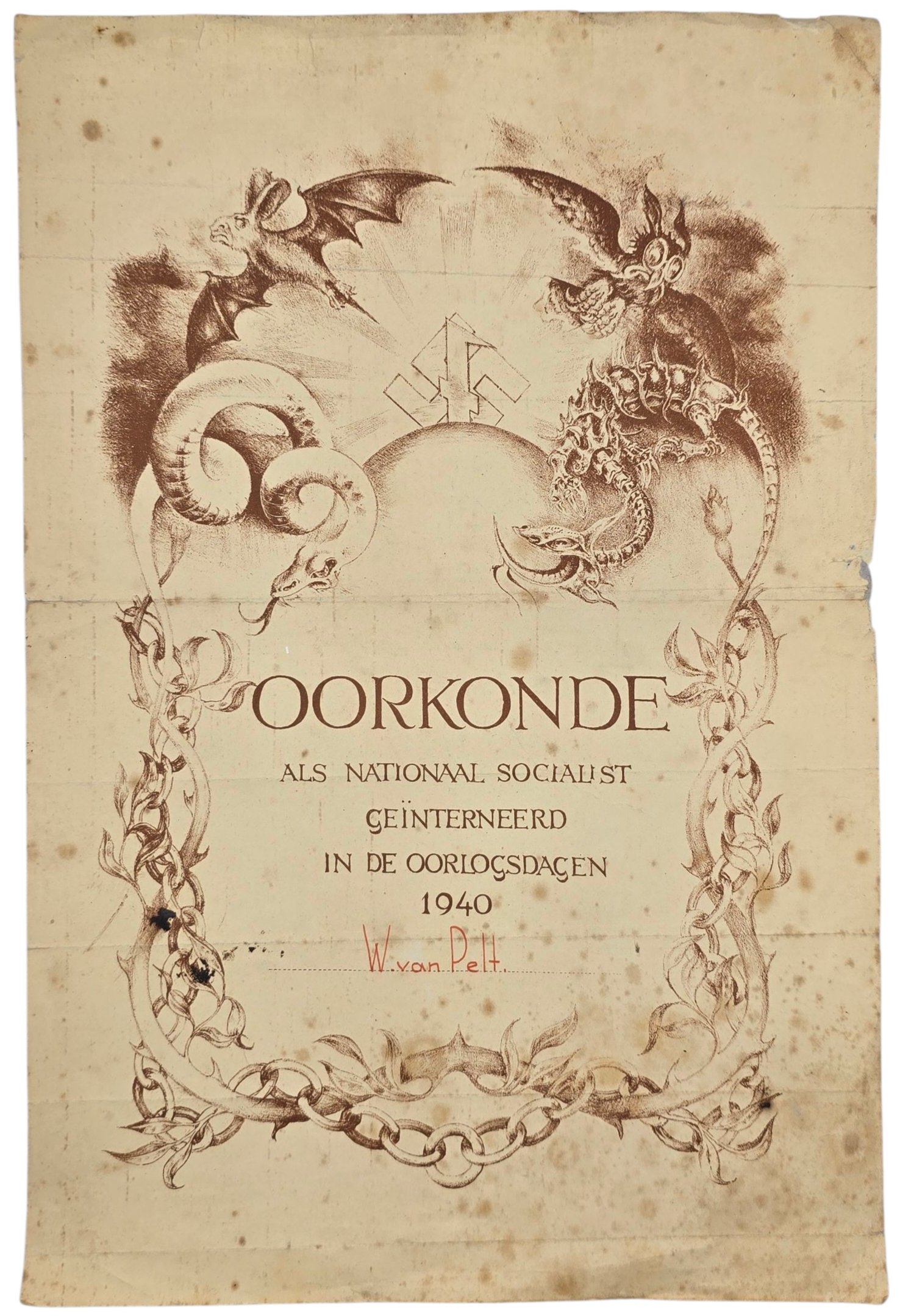 Original WW2 Dutch Collaboration NSB Document - NSB Citation Oorkonde internment in May (1940)During the German invasion of the Netherlands in 1940, Dutch national socialists were imprisoned for fear of their joining the German occupier. After the war, the NSB awarded all imprisoned members a citation with a medal coin.Named W. van Pelt, most probably from Schiedam. This citation was repaired at the backside with tape.Origineel Wo2 Nederlands Collaboratie NSB Document - NSB oorkonde Internering mei (1940)Tijdens de Duitse inval in Nederland in 1940 werden Nederlandse nationaalsocialisten gevangengezet uit angst dat zij zich zouden aansluiten bij de Duitse bezetter. Na de oorlog kende de NSB alle gevangengenomen leden een dagvaarding toe met een penning.Genoemd W. van Pelt, mogelijk uit Schiedam. De oorkonde is geplakt aan de achterkant in het midden.