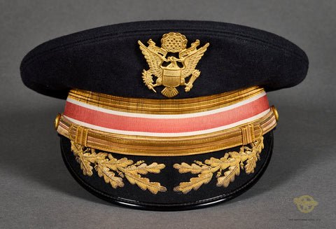 US Army Officer's Cap for Artillery Vietnam Era-This is a private purchase, and is a gorgeous cap. This is made by the Bancroft Military Caps of Framingham Mass. It is made of a high quality felt that is free of moth nips and tracking. This cap has a great shape. The insignia on the cap is made of a nicely toned brass. The center band is a red and white ribbon that is slightly faded, this is flanked on either side by a nice multi colored gold flatwire ribbon. There are gold buttons on each side. The gold bullion leaves on the visor are gorgeous and nicely toned. The visor is tightly attached and excellent. The inside is very clean, and very well marked. It is marked with both the makers' name, as well as the army approved certification mark. The inside is lined with yellow quilted silk material. The moisture shield is well marked and in place. The brown leather sweatband is in place and is still soft and supple. There is a nice bow at the back, inside of the cap. This cap would be for a size 55.Overall, this is excellent in every way.