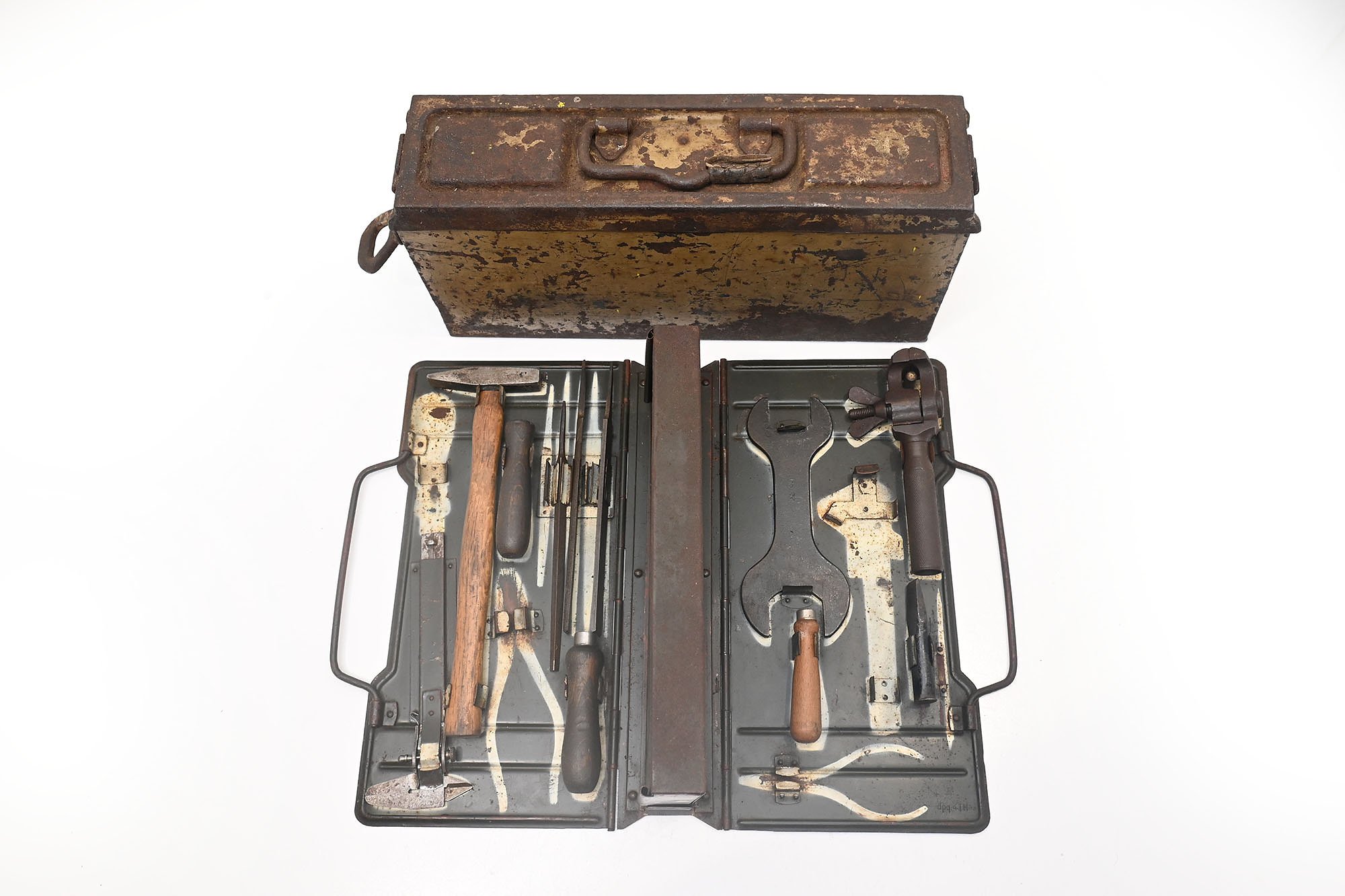 This is a German Waffenmeister (arms master) tool set for the MG34/MG42 machine guns from World War II.These sets were used in the field by German armorers to maintain and repair the MG34 and MG42 machine guns.The box is nicely filled and almost complete...many parts are nicely stamped.The set was cleverly designed to fit neatly into a standard ammo box.A rare and special collector's item!
