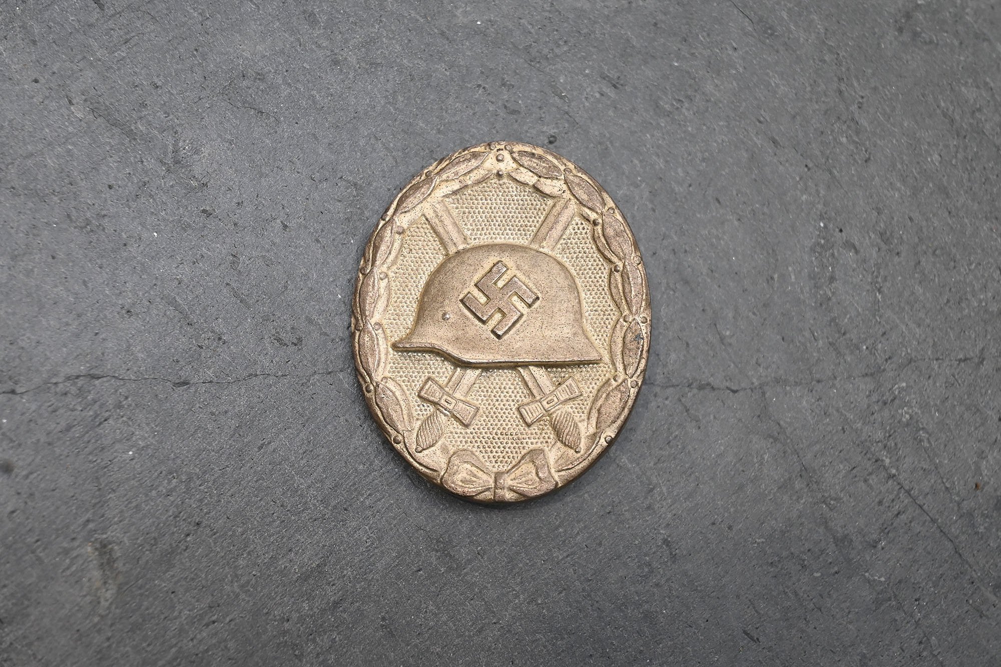 Zilveren Gewondeninsigne (Verwundeten Abzeichen in Silber). Met het uitbreken van de Tweede Wereldoorlog, op 1 september 1939, voerde Hitler een licht gewijzigde versie van het verwondingeninsigne opnieuw in door de helm uit de Eerste Wereldoorlog te vervangen door de nieuw ontworpen M35-helm. Het insigne werd toegekend aan zowel militair als niet-militair personeel in uniform, en later (maart 1943) aan burgerpersoneel dat gewond was geraakt door vijandelijke acties. Het insigne van het type 'Zink' is mooi gemarkeerd met het nummer '100', wat duidt op productie door de firma 'Wächtler & Lange' uit Mittweida. De speld en sluiting zijn uiteraard nog volledig functioneel. Het insigne heeft nog bijna zijn originele zilveren afwerking. Een mooi exemplaar in zeer goede staat!