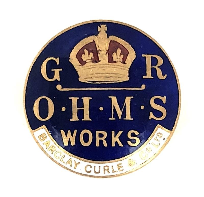 A scarce original First World War period ' Barclay, Curle & Co Ltd On His Majesty's Service Works identification numbered badge'; gilt convex circlet inlaid with blue enamel 'Crown G R' over 'O.H.M.S' with white company title below; the reverse impressed with maker's details 'W.J.Dingley B'Ham' and official issue number '3336'. Very good condition, complete with original buttonhole fitting, no damage to the enamel.Diameter approx 25mm.