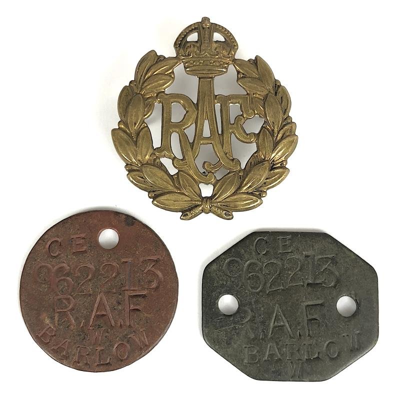 A good original pair of wartime composition ID tags issued to 'W.BARLOW 62213 R.A.F.' plus an 'Royal Air Force brass cap badge'. Very good condition.The Royal Air Force service number would indicate that W.BARLOW enlisted at RAF Station CARDINGTON in September 1939.