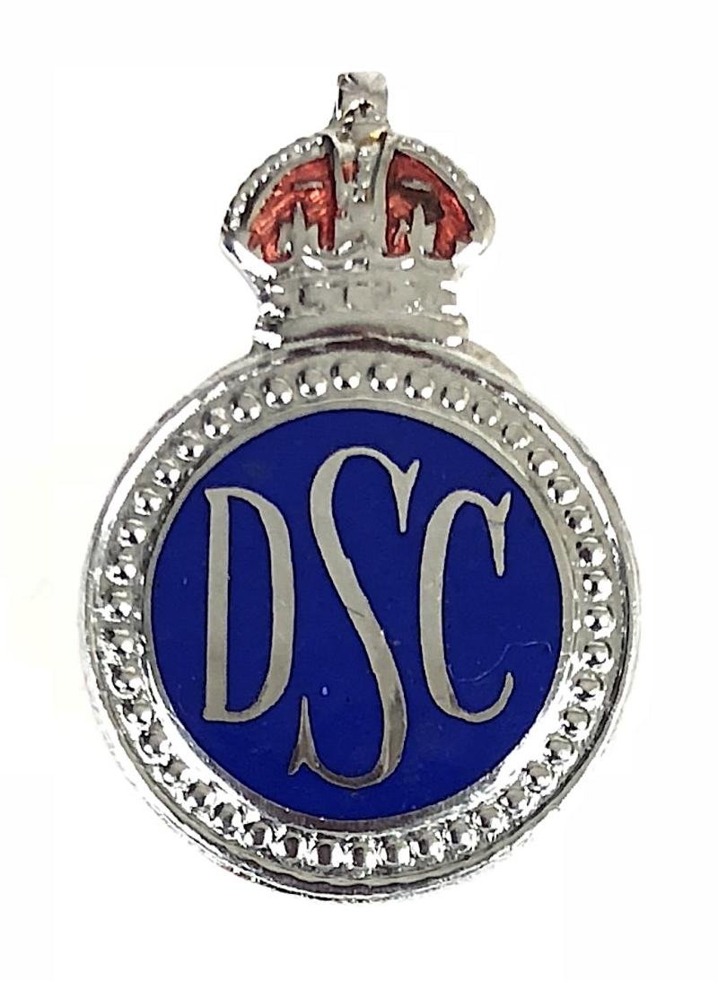A rare original pre 1943 period Second World War period 'Dover Borough Special Constable Police lapel badge'; chromium plated King's Crowned dotted title surround, the central disc depicting the distinct capital letters 'DSC' on blue enamel ground; the reverse impressed with maker's details 'Thomas Fattorini Ltd Regent St Birminham'. Very good condition, complete with original pin fittings, no stress marks or damage to the enamel.Height approx 29mm.