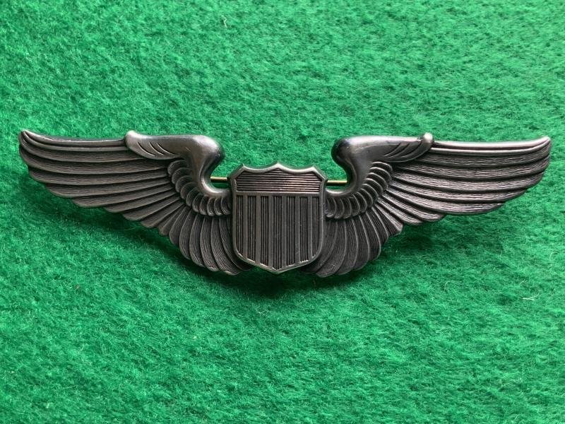 Here we have a good example of the USAAF WWII pilot wing, pin back with safety catch and in Sterling Silver. A perfect one piece construction wing.Full size at 3'