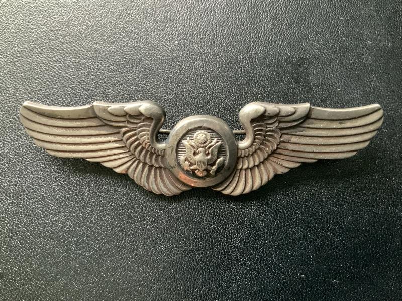 Here we have a USAAF Aircrew Member. Pin back example in Sterling Silver. One piece construction which is one of the best Aircrew wing I have seen. With service wear and patina.Full size at 3 1/16'