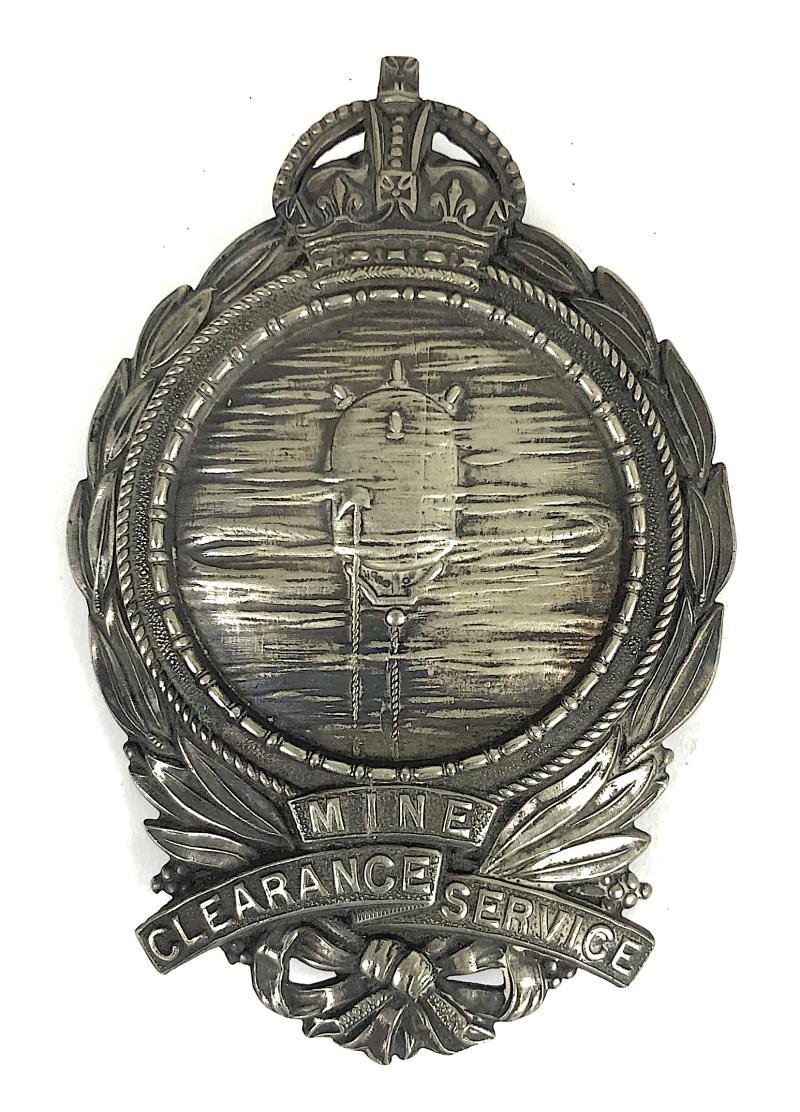 A scarce ORIGINAL circa 1918 'Royal Navy Mine Clearance Service cuff badge'; large die-stamped silvered example depicting a floating mine within a Crowned wreath. Good condition, complete with both original loop fittings and split pin, backing plate absent.Height approx 82mm.Formed at the end of the First World War.