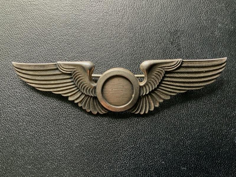 This is a scarce WWII USAAF Combat Observer Wing. Pin back with safety clasp in sterling silver marked marked, made by LGB. This is quality manufacturer with detailed feathering, solid one piece strike.Full size at 3'The 'WWII USAAF combat observer wing' refers to the insignia worn by non-pilot aircrew members in the United States Army Air Forces (USAAF) during World War II. These badges, officially the Army Air Force Observer Badge, were for individuals who didn't qualify as pilots but were part of the flying crew