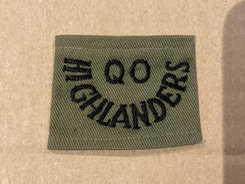 Queens Own Highlanders, circa 1962-64 Borneo counter insurgency & Brunei Revolt theatres cotton jungle warfare shirt epilate slide.Mint condition black letters on olive drab cotton.