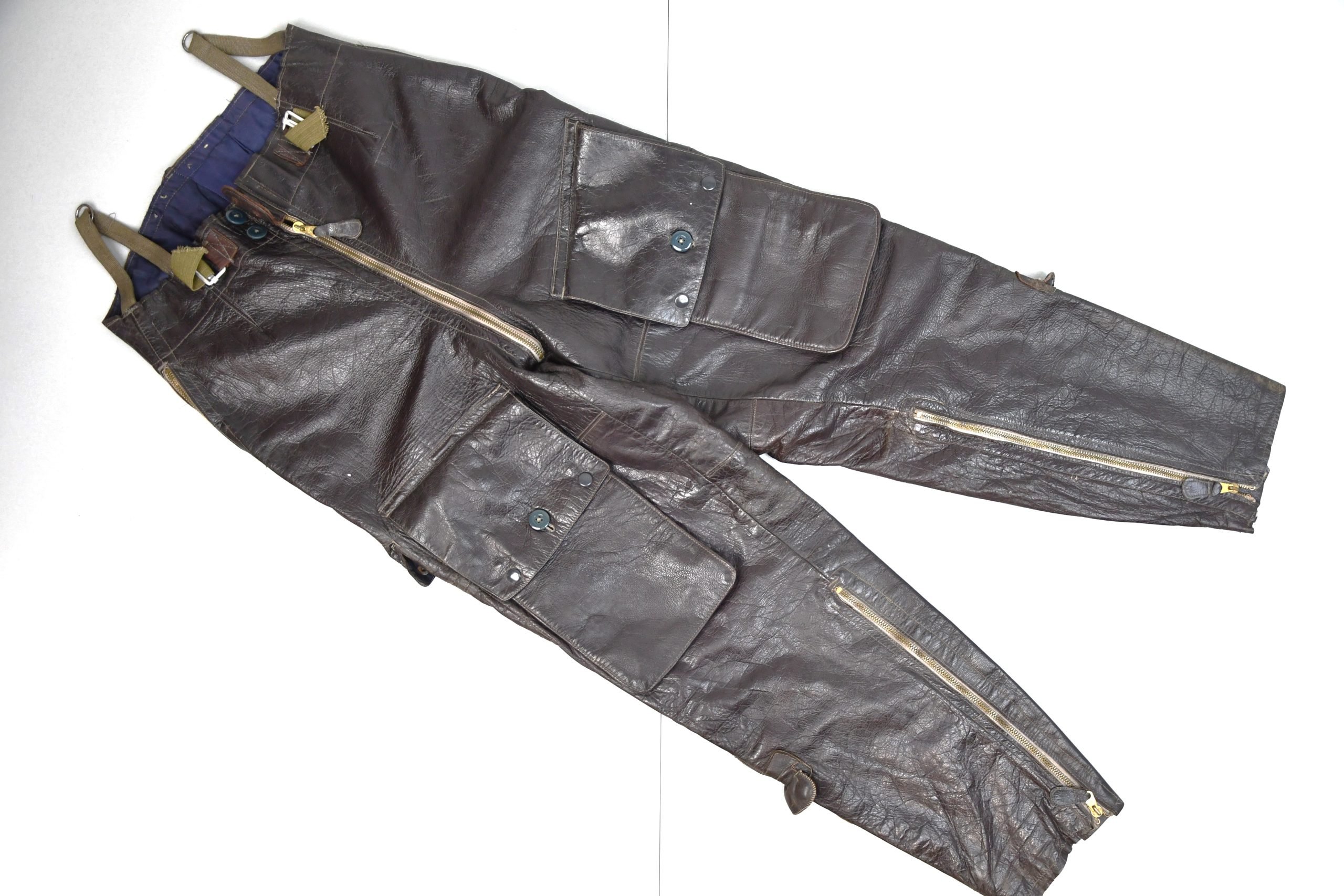 Very nice and extremely desirable leather late war flight trousers for Luftwaffe pilots. Late model so called 'Reichsverteidigung Jagdflieger hose' or Reich Defense Fighter Pilot trousers. The trousers are light worn and fairly complete. Just some damaged/missing straps at the anles, and some missing lugs in one of the leg pouches. Still complete with gravity knife rope inside. All zippers present (condition: see pictures!). Manufacturer tag inside with RBNr. 0/1007/0182.