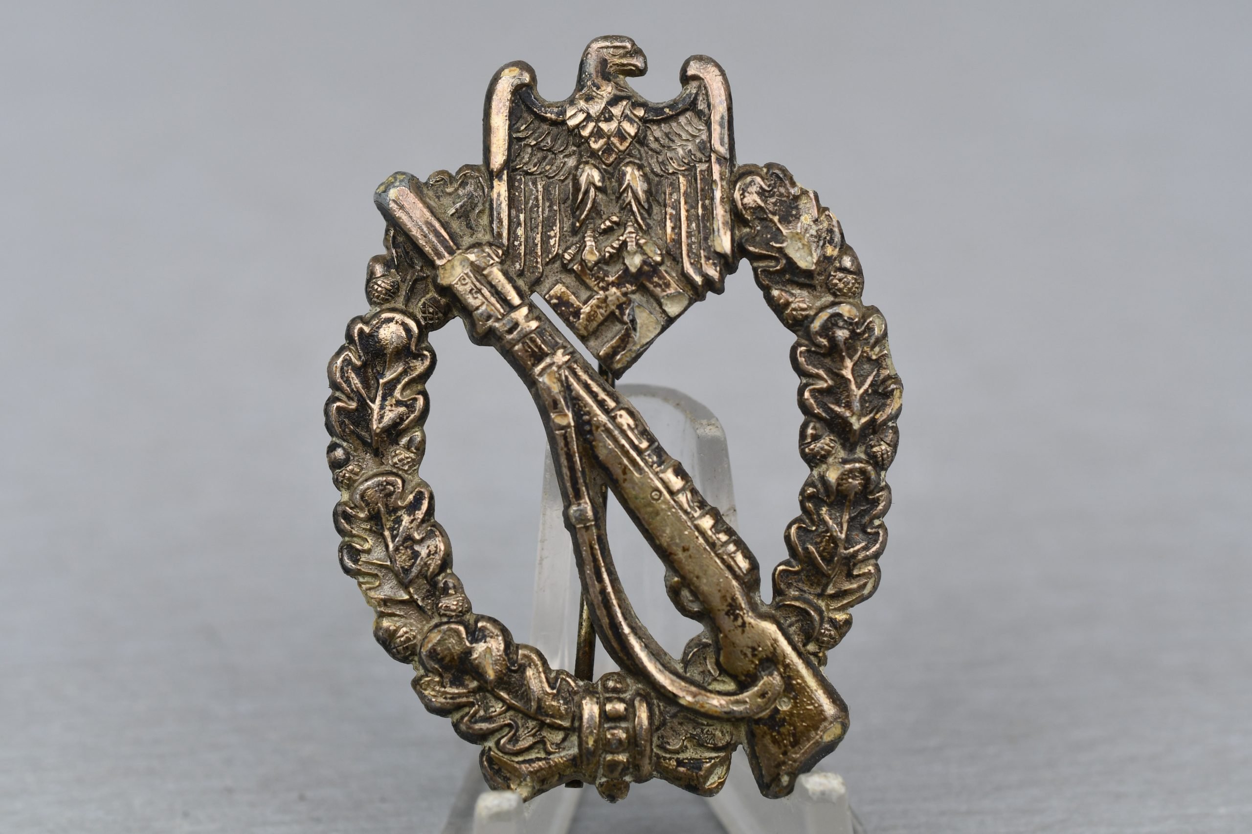 Rarely seen variant of the infantry assault badge in silver, made by Frank & Reif. Unmarked example executed in zinc with silver finish. Shows wear and damages.