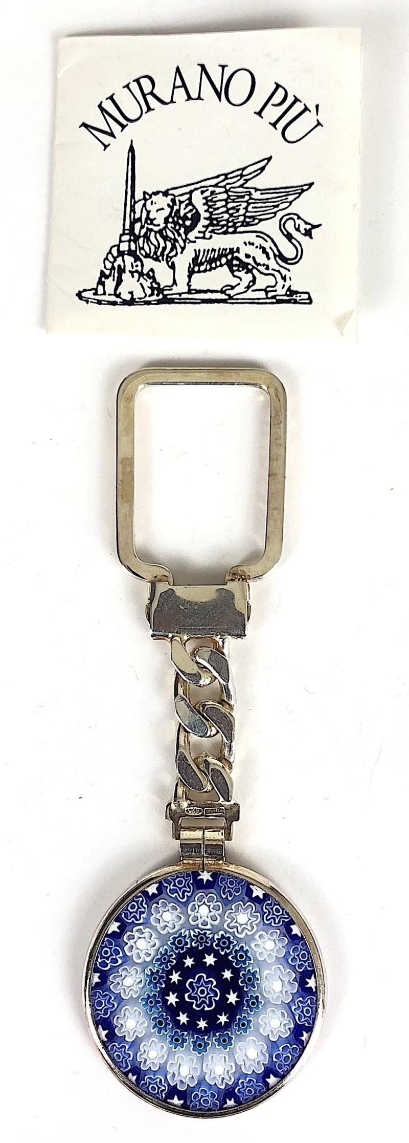 A good original vintage period 'Murano Più Glass silvernovelty fob'; very attractive double sided example in a white and blue flower design, the reverse impressed '925' silver. Very good unused condition, complete with original red plush case, with one flap detached but present.Diameter approx 32mm.