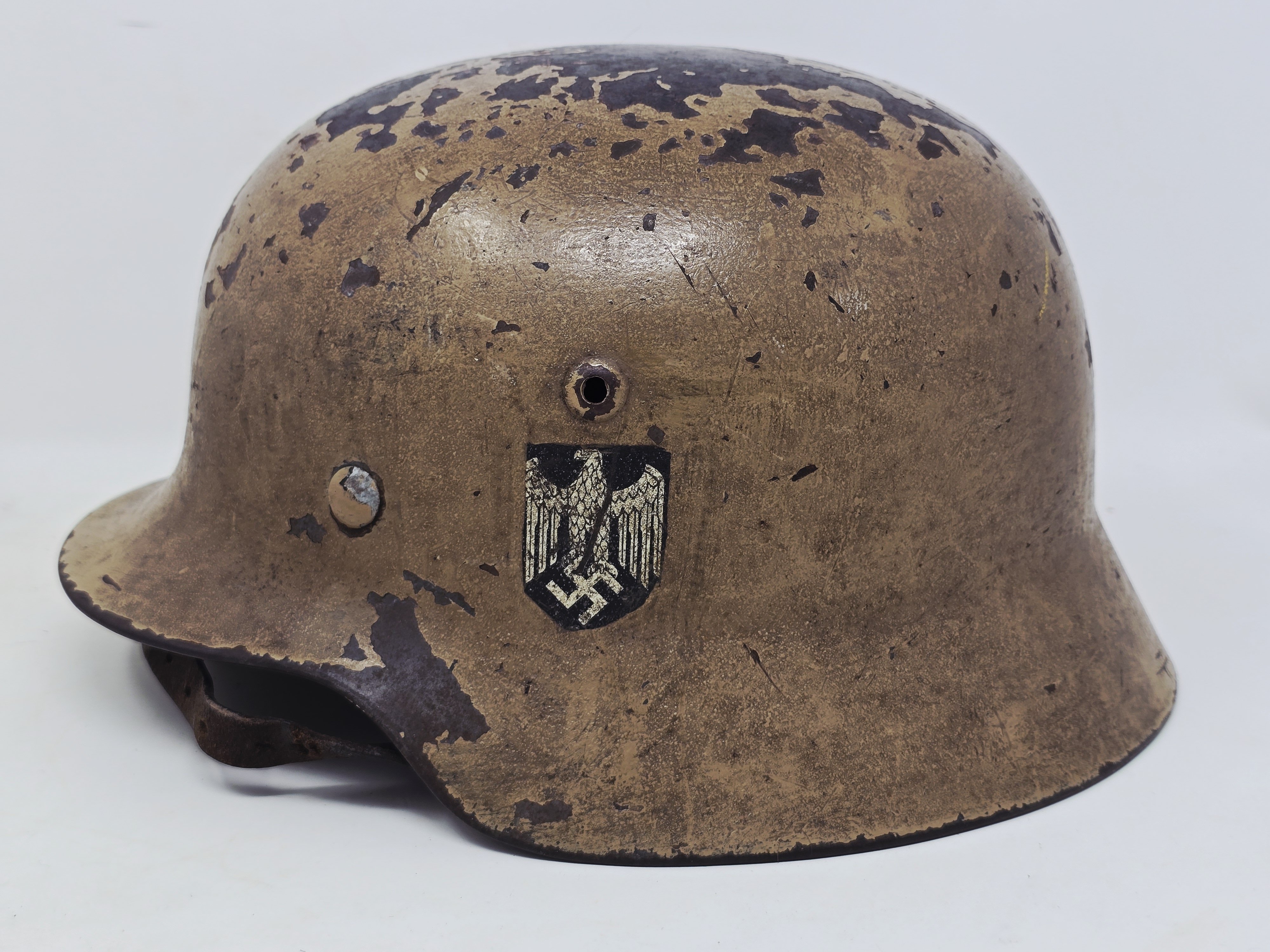 These do not come out for sale often, and this example is just great. The helmet is ET66 M35, #R (mid 1935 manufacture), with an upgraded double ply liner dated 1939 that is completely untouched original to the helmet. The finish overall shows a thickly applied layer of tan camouflage, with the adler decal left in the open, with some paint encroachment on the leading edge. This finish shows a lot of sun wear, as does the underlying feldgrau, which is very sun darkened. The liner and strap show service wear commensurate to a harsh subtropical climate, such as north Africa and Sicily / Italy. There is no capture information available on this piece, but the forensics indicate this is a truly remarkable example of a Heer DAK, with possible subsequent southern front use. A capstone piece, from a very famous long-time collection, ready for its new owner. COA accompanies.