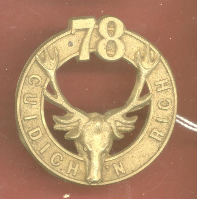 A fine die-stamped brass circlet bearing 78 CUIDICH'N RICH; stag's head to voided centre. Two toned loops to the reverse. VGCThis pattern also worn by 78th Highlanders pre 1881