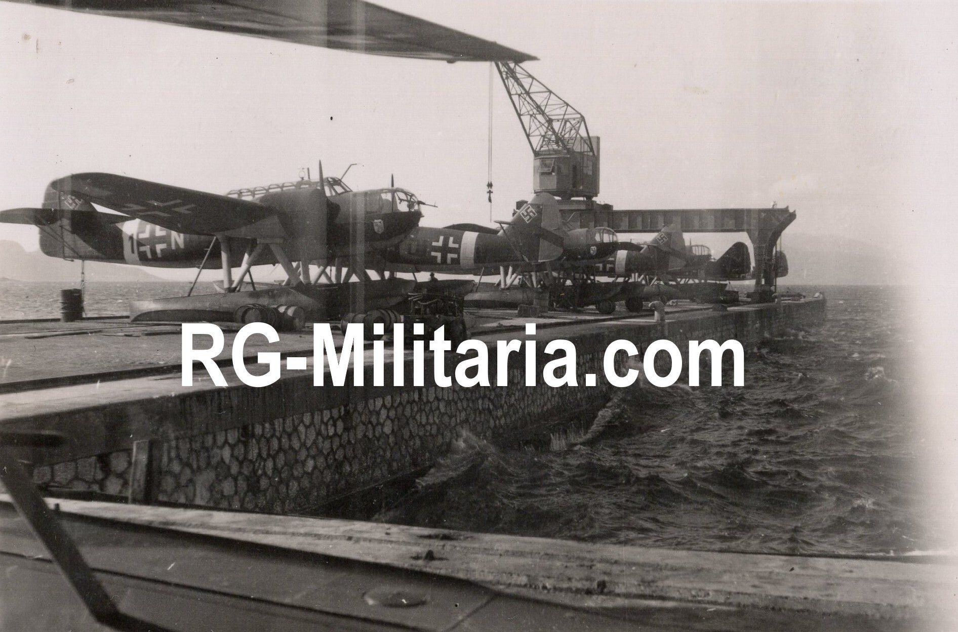 Original WW2 German Photo - Luftwaffe captured Dutch Beutewaffen Fokker T8 water airplanes at Skaramanga, Greece