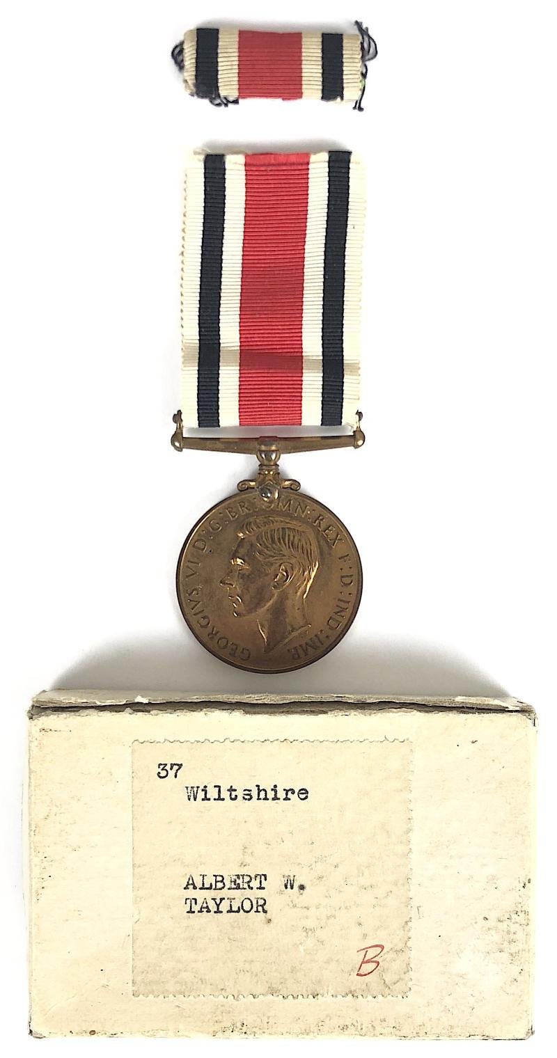 A good full sized Coinage profile with IND: IMP 1937 - 1948 'King George VI Special Constabulary Long Service bronze medal' the reverse inscribed in relief 'For Faithful Service in the Special Constabulary', complete with original silk ribbon raw edge, the rim impressed to the recipient 'ALBERT W. TAYLOR' and contained in original Box of Issue inscribed '37 Wiltshire'. Very good condition.Diameter approx 36mm.
