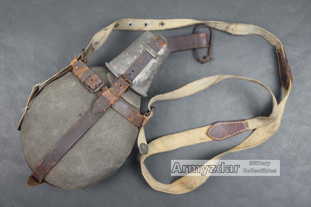 This is a very nice untouched WW1 German army medic canteen. The canteen is complete with shoulder strap, belt loop and drinking cup. The cover has maker's stamp and date 1918.