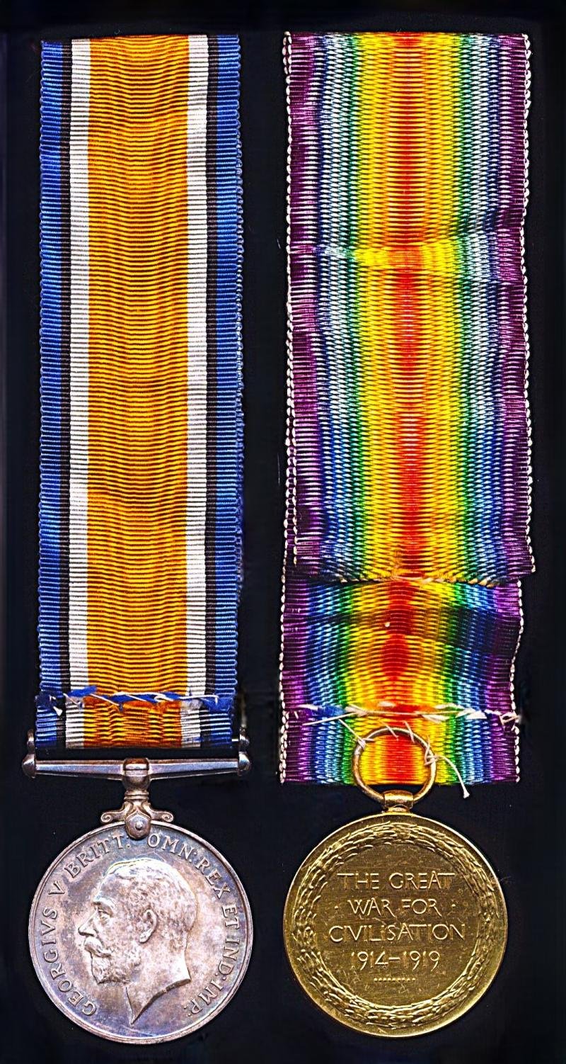- British War Medal. Silver issue (19704 Pte. R. Andrews. R.War.R.)- Interallied Victory Medal (19704 Pte. R. Andrews. R.War.R.)Killed-in-Action: Lance-Corporal Richard Andrews 2nd Battalion Royal Warwickshire Regiment, is confirmed 'Killed-in-Action', in Belgium, at Polygon Wood, during the Battle of Passchendaele (Third Ypres), on 9 October 1917The body of Richard Andrews was recovered from the battlefield, and now lies buried at the Buttes New British Cemetery, Polygon Wood, Belgium, where the memory of his life, services and supreme sacrifice, is commemorated in perpetuity by the Commonwealth War Graves CommissionMedals Verification: The Great War medals both verified, as the recipients full posthumous medal entitlement for the Great War, per the respective medal rolls of the Royal Warwickshire Regiment, referenced as under:- British War Medal. Silver issue: WO 329/735. Roll shows recipient served with 2nd Battalion Royal Warwickshire Regiment- Interallied Victory Medal: WO 329/735. Roll shows recipient served with 2nd Battalion Royal Warwickshire RegimentRichard Andrews son of Richard Andrews () & Ellen Andrews (nee Anderson & employed as a Jute Weaver), was a native of Small Heath, Birmingham, Warwickshire, England, where he was born on, in 1899. At the time of the 1901 National Census for Scotland, James was living with his parents and 3 x elder siblings, brothers Andrew Y. Eadie (8) & Alexander F. Eadie (4), and a sister Jessie Eadie (6), at the family residence which was then located at, No 118 Rosebank Street, Dundee. James was a teenager when he enlisted in the British Army at Dundee and he was still a teenager, of 9 years of age, when he was killed-in-action. At the time of his his death, his father was his notified next-of-kin, who received the effects and service estate of his fallen son, the grieving parents residence being located at, 6 Kinnaird Street, Dundee. One or other of his siblings had migrated to Canada prior to the death of James Eade, as two notices published in the local Dundee newspapers following his death include the note 'Canadian papers please copy'The Great War medals fitted with their original bright silk moire ribands, period stitched and fitted in 'reverse' order, as displayed by the grieving parents & familyThe medals in choice condition, with attractive patina to the BWM and the Interallied Victory Medal virtually pristineCondition: EF