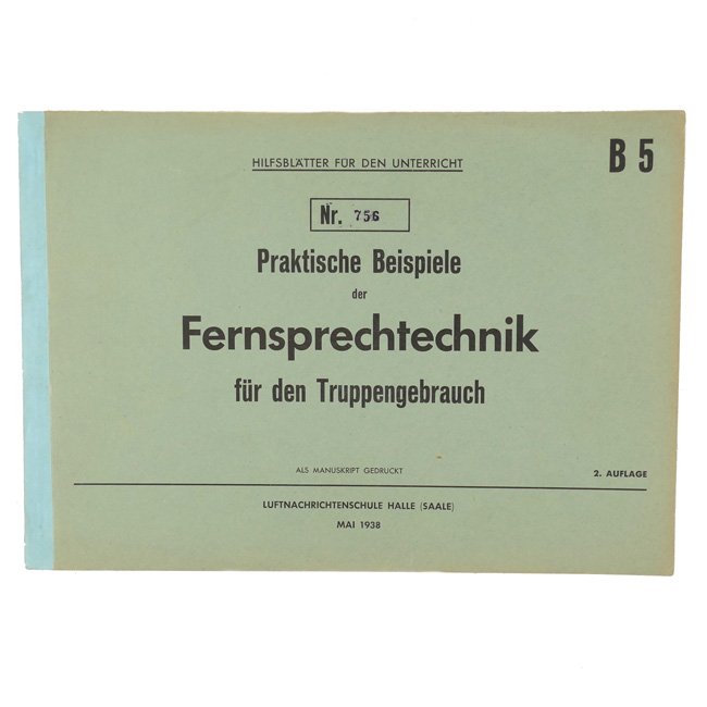Luftwaffe Communication Equipment Instruction Manual: 'Praktische Beispiele der Fernsprechtechnik' (Practical examples of telephone technology) showing instructions for usage with various field telephones (FF33), desk telephones and all related equipment. The manual was published by the 'Luftnachrichtenschule Halle (Saale)' in May 1938. The book is illustrated with many black&white photographs and/or illustrations showing all possible set-ups for usage with telephone technology. This is the first such manual I've seen and certainly very rare and a must have for the (field)telephone collector. Very rare and interesting original manual!