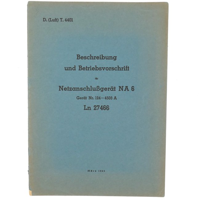 Luftwaffe description and operating instruction manual for the 'NetzanschluĂgerĂ€t NA 6' - D.(Luft) T.4401. The booklet was published by the 'Reichsminister der Luftfahrt und Oberbefehlshaber der Luftwaffe' on 30 May 1941. The booklet features 13 pages illustrated with many black&white photographs and/or illustrations, complete with fold-out sheet in the back. The booklet is in very good only slightly used condition, see photos. Nice original manual in very good condition!