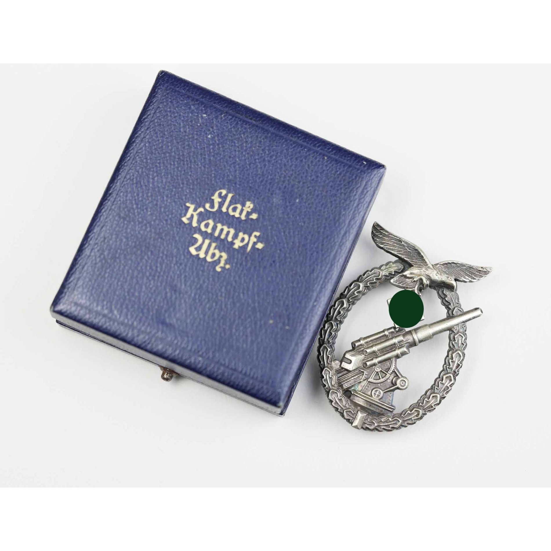 Luftwaffe Flakkampfabzeichen im Etui, Herst. Gustav Brehmer in Buntmetall!