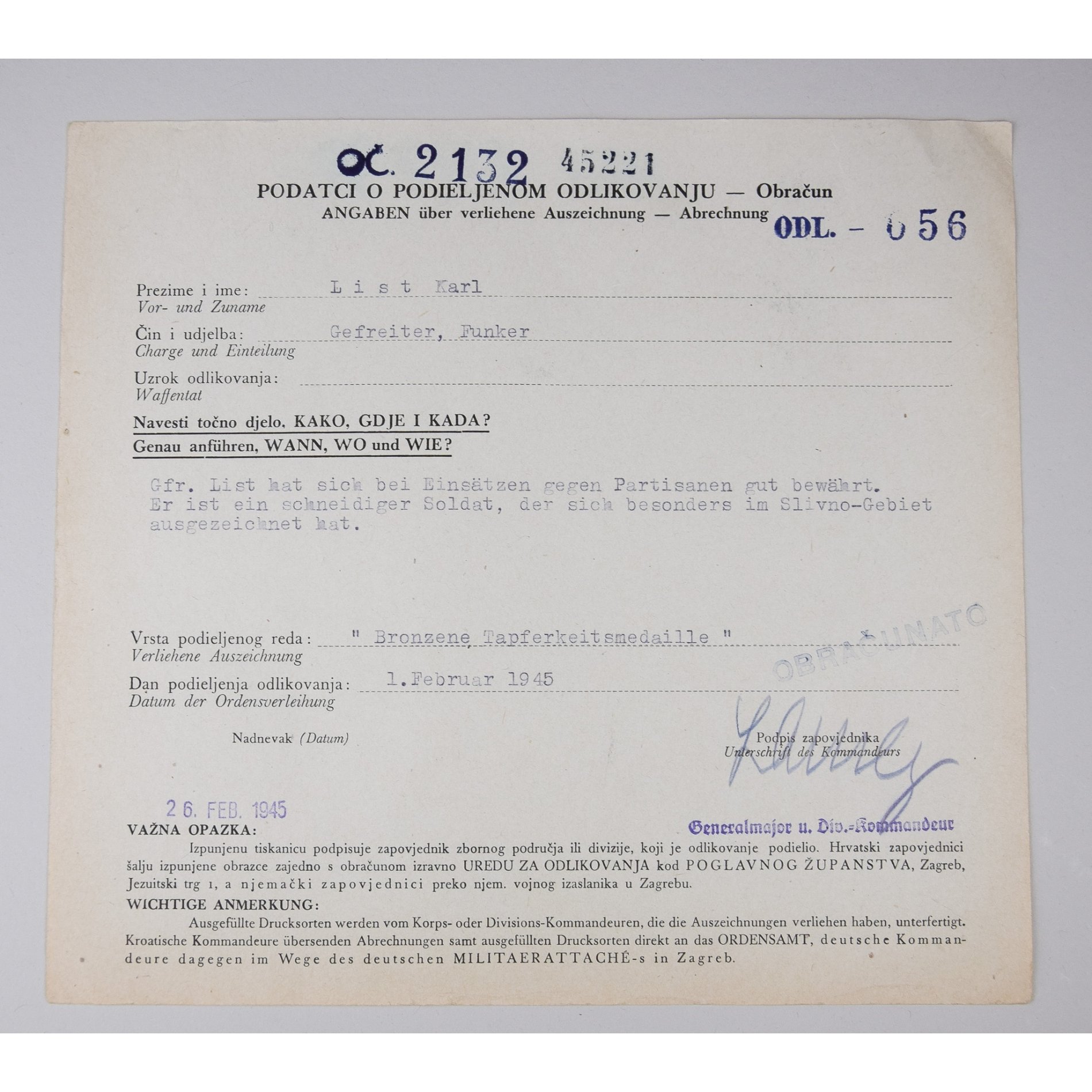 Urkunde Nachweis Verleihung der bronzenen Tapferkeitsmedaille Kampf gegen Partisanen im Slivno Gebiet