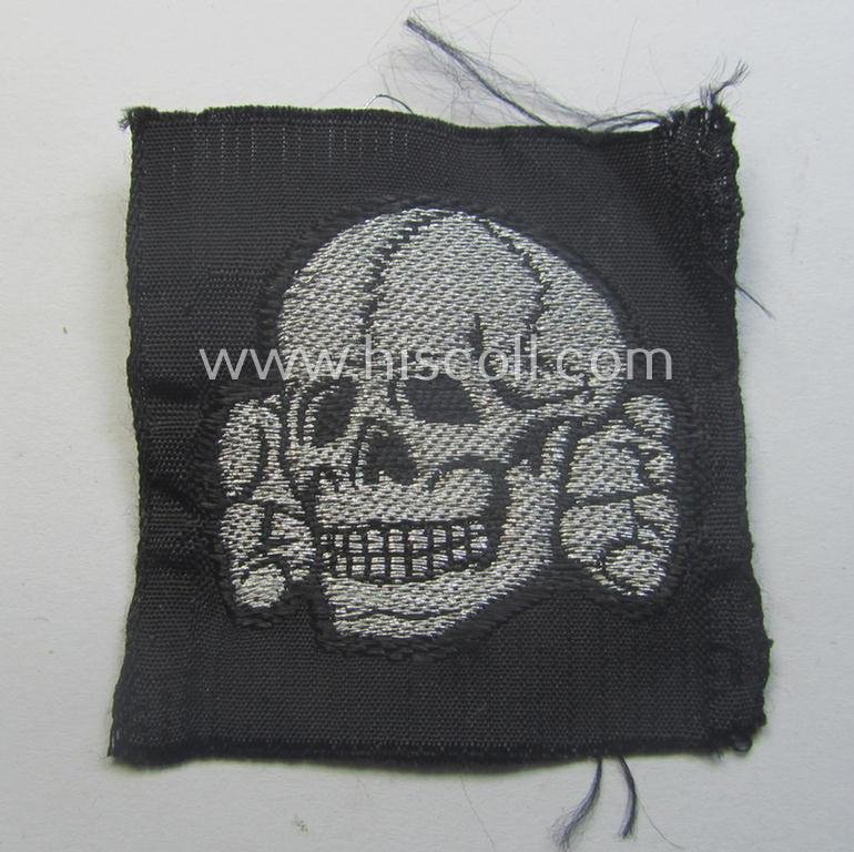 The truly very attractive - exceedingly rarely encountered and nowadays almost impossible to find! - Waffen-SS-related, 'BeVo-flatwire'-woven-style skull (ie. 'Totenkopf für Führer der Waffen-SS o. Offz. Schiffchen o. Einheitsfeldmütze') on offer here is neatly executed in so-called: 'BeVo'-weave, 'flatwire'-pattern (and is executed in bright silver-coloured linnen onto a black-coloured- and/or also, linnen-based background). As such, it can naturally easily be mounted onto any Waffen-SS officers'-type side-cap (ie. 'Schiffchen für Führer') or even 'M43'-type-cap (ie. 'Einheitsfeldmütze'). The desirable - somewhat smaller-sized! - skull comes in a 'virtually mint- ie. unussued' condition and came as straightly cut-of the role (as can be seen on the pictures). The piece is just a tiny bit stained and/or wrinkled (simply caused by years of storage and/or handling only). It should be noted that these original, 'BeVo-flatwire'-woven, Waffen-SS-related cap-skulls are almost impossible to find and can nowadays easily be graded 'exceedingly rare' something that merits my (high) asking-price!