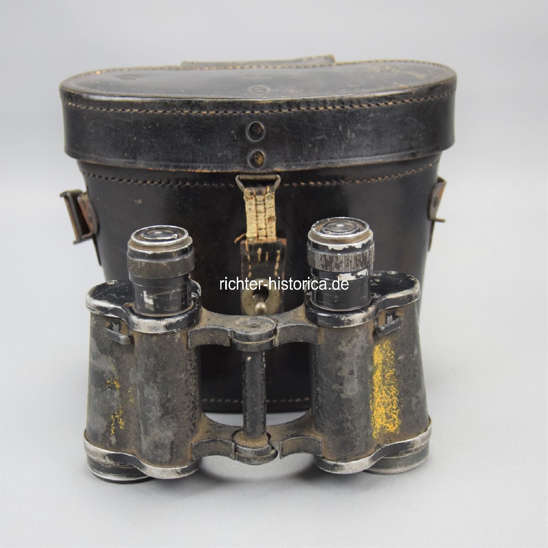 Dienstglas der Wehrmacht im Lederköcher. Hersteller ddx, die Durchsicht nicht klar, leichte Flecken vorhanden. Deutlich getragenes Dienstglas, auf der Linse fehlen die Ringe, ohne Riemen. Der Lederköcher im guten Zustand, oben mit 'I' gestempelt, Zustand 2. Das Dienstglas im Zustand 3-