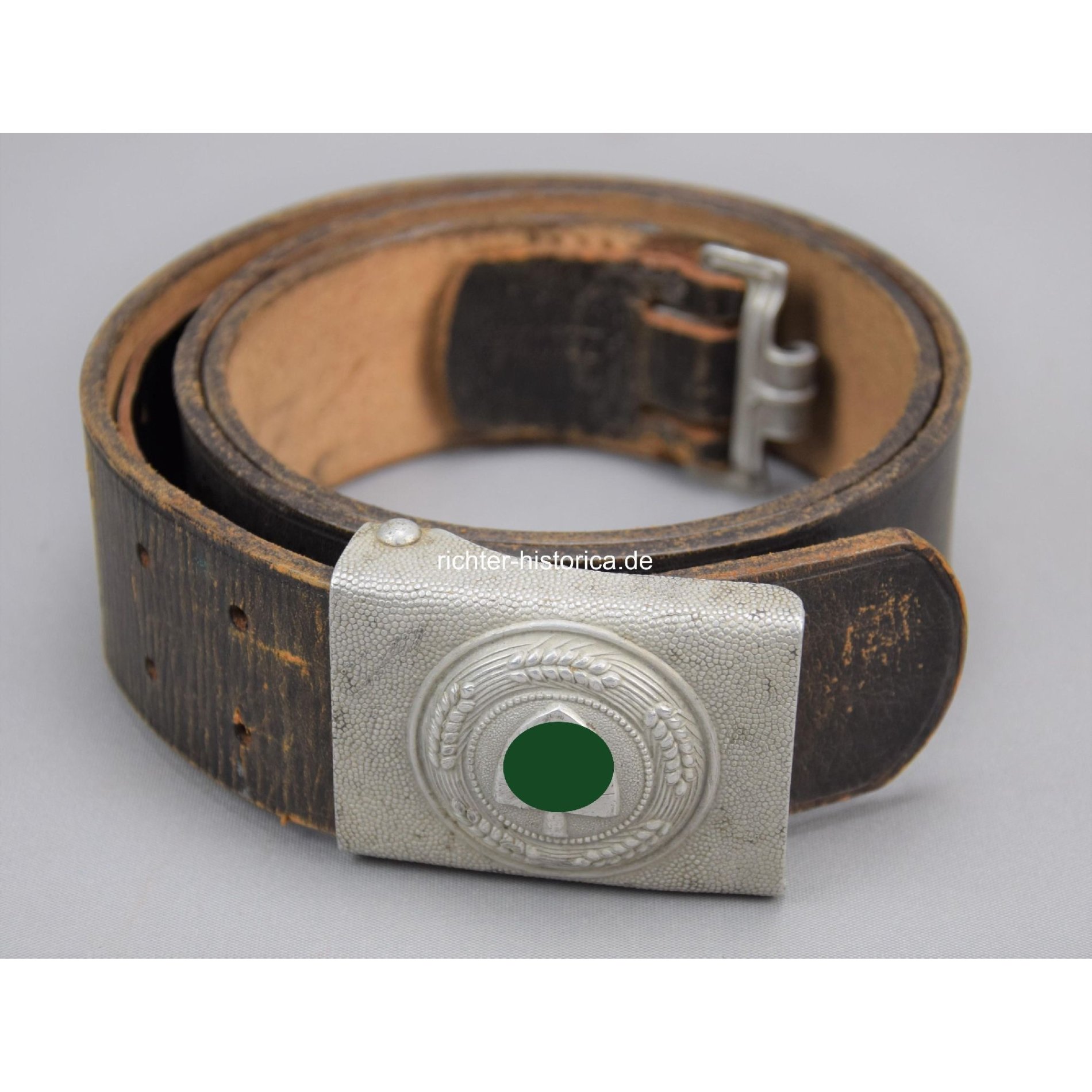 Aluminium Koppelschloss, ohne Hersteller, am Lederkoppel, Gesamtlänge 105cm. Auf dem Riemen mit Hersteller Z.U.V.R.K. Das Emblem vom Koppelschloss minimal eingedrückt, getragener Zustand.