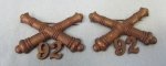 Original period manufacture. Pair of darkened bronze collar insignia for the 92nd Artillery. Near new condition.