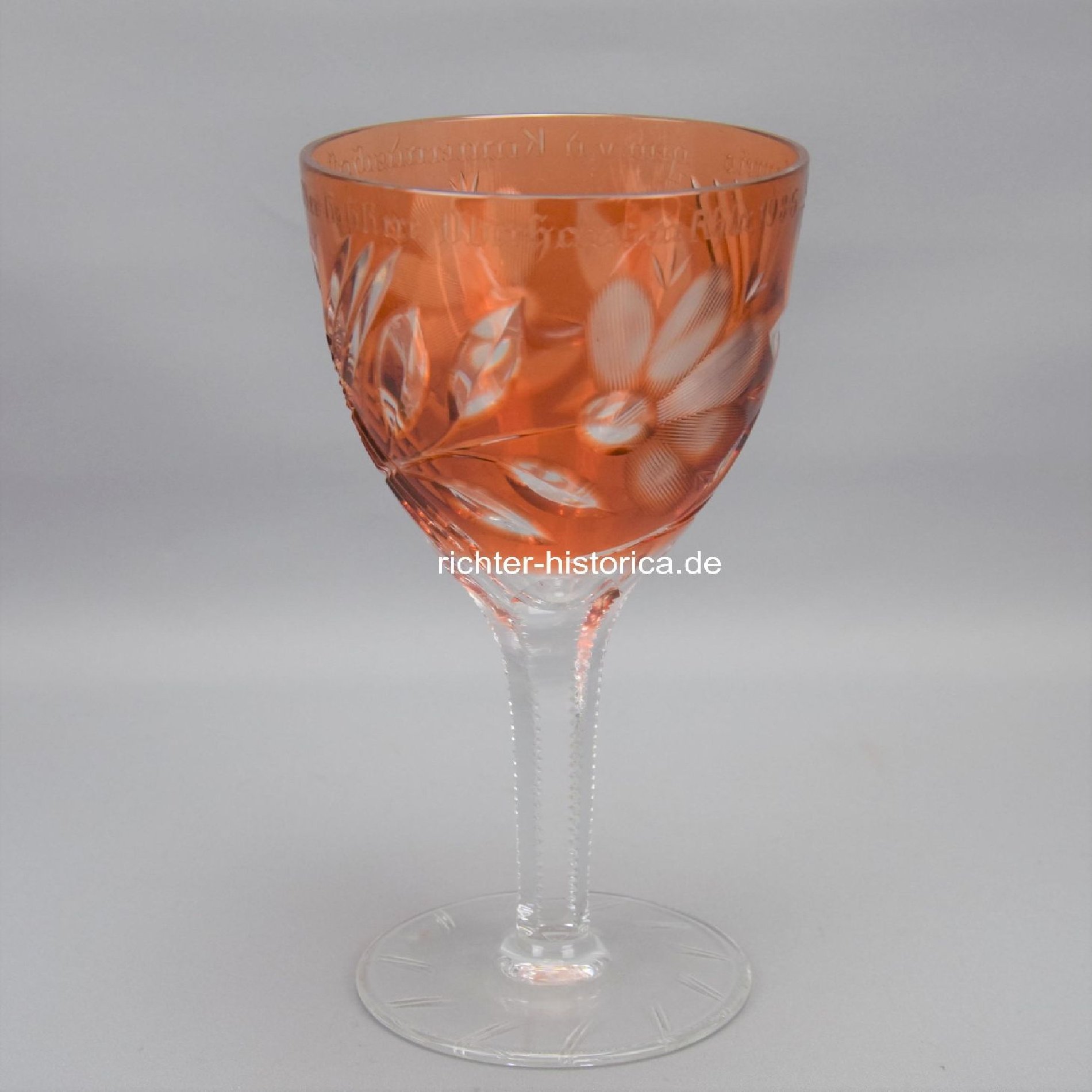 Großer Schießpreis aus Glas gefertigt, oberhalb mit Aufschrift 'Schießpreis gem. v. d. Kameradschaft ehem. 39er Füsiliere Oberhausen RHLD 1935' Rot gefärbtes Glas mit mehreren aufwendigen gravierten Blüten, handgeschliffenes Glas. Gesamthöhe 24,5cm.