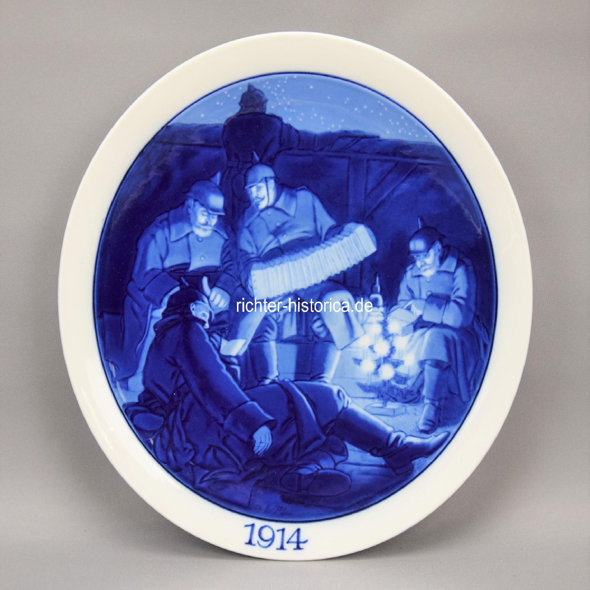Meissener Porzellanteller, Aufschrift '1914' Soldaten an der Front, Weihnachten 1914. blaue Knaufschwerter, 1. Wahl. Rückseitig mit Aufhängung, Zustand 2+