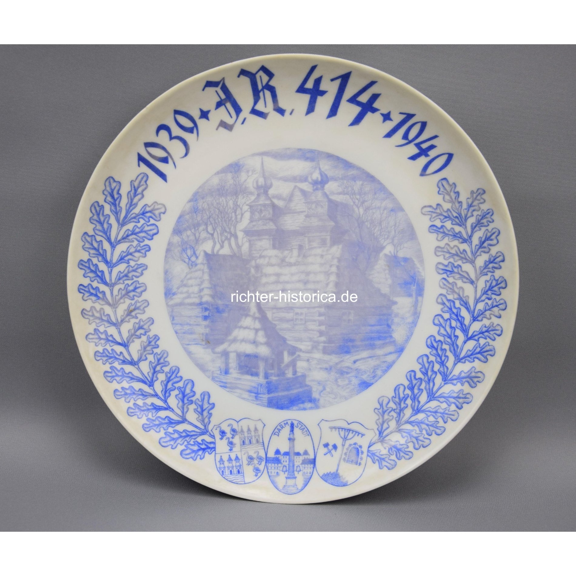 Porzellanteller zur Erinnerung an 1939, A.R. 414, 1940. Vorne mit Stadtwappen von Darmstadt, rückseitig mit Hersteller Kaestner, Saxonia. Am Rand mit einer Beschädigung, die blaue Malerei ausgebleicht. Zustand 3-